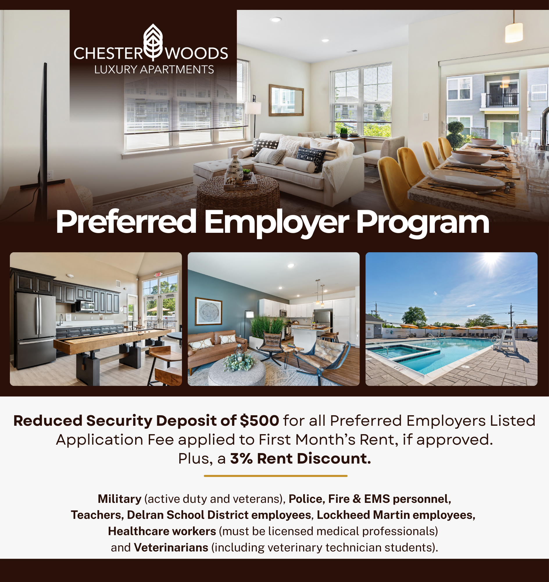 Terms & Conditions: Exclusive offer for NEW TENANTS who are Military (active duty and veterans), Police, Fire & EMS personnel, Teachers, Delran School District employees, Lockheed Martin Employees, Healthcare workers (must be licensed medical professionals) and Veterinarians (including veterinary technician students) when signing a 12-month lease.